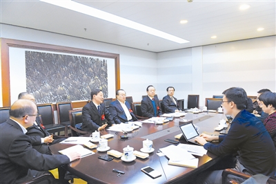 1月11日晚,十九届中央纪委二次全会在会议期间安排媒体集中采访,5位与会代表向记者畅谈学习习近平总书记重要讲话精神,开创全面从严治党新局面的体悟和思考。图为采访现场。记者 何韬 摄